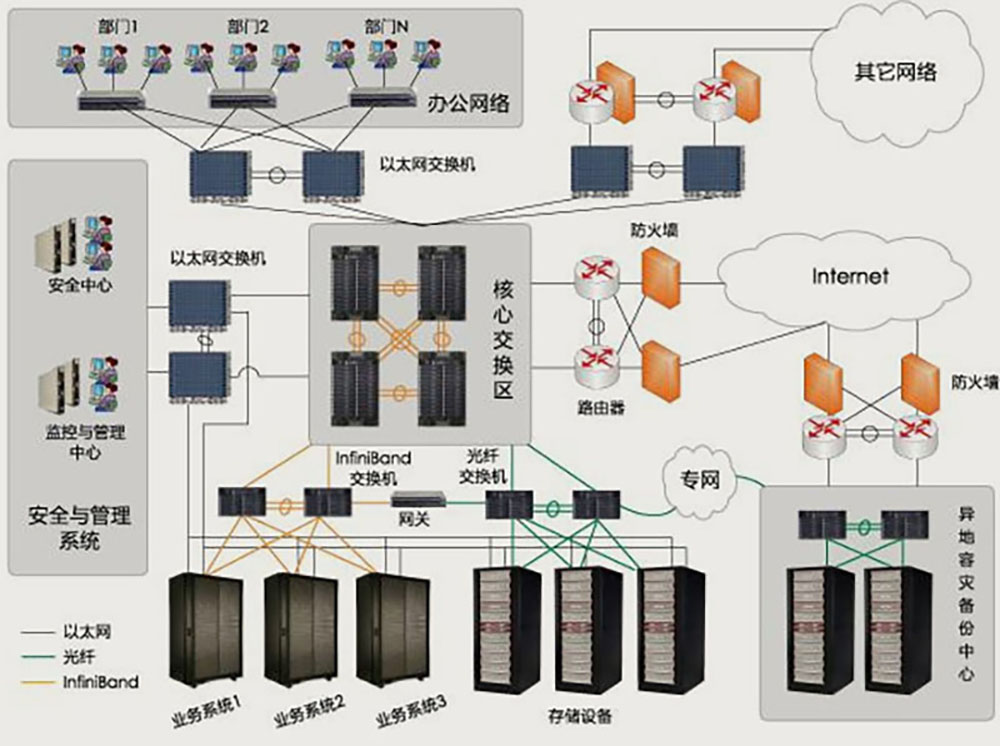 负责企业支撑;生产等业务系统运行。一般业务系统可通过以太网组网,进行不同应用系统间数据的共享与处理;当需要大数据量计算与处理时,或者需要高速互联传输时,可通过InfiniBand组网,实现高性能的互联计算,解决以太网遇到的I/O瓶颈问题。