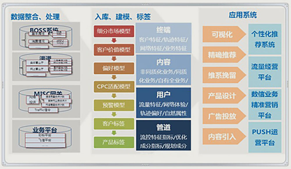 海存量公司可对运营商的BOSS系统、渠道、MISC网关及业务平台的海量网络数据进行整合、处理后,构建大数据的全息数据池并开展数据深度挖掘,依据业务终端、内容、用户、管道等属性特征建立细分市场模型、客户价值模型、偏好模型、CPC适配模型、预警模型、客户标签和产品标签等,最后,根据数据分析结果制定针对性的运营策略方针开展业务精确营销。